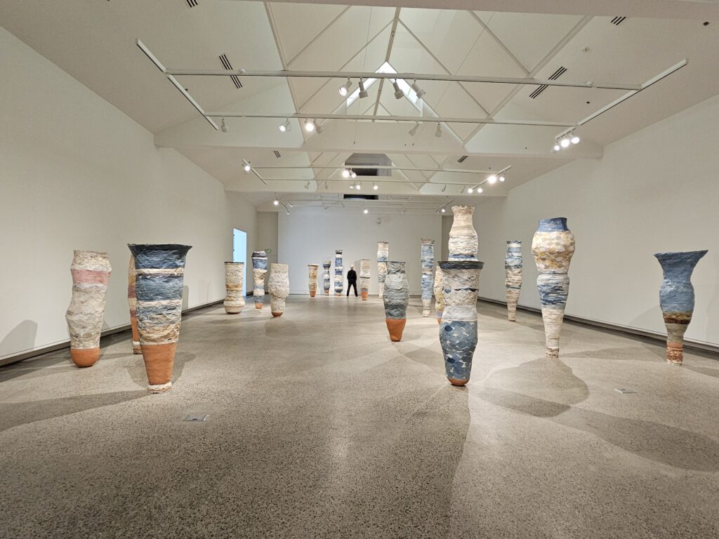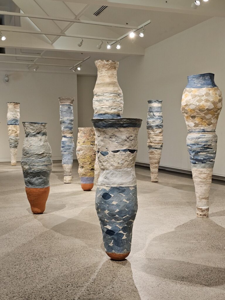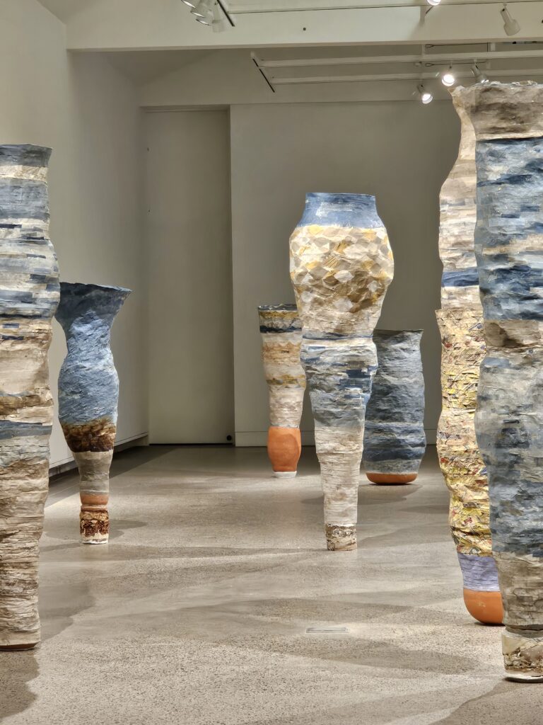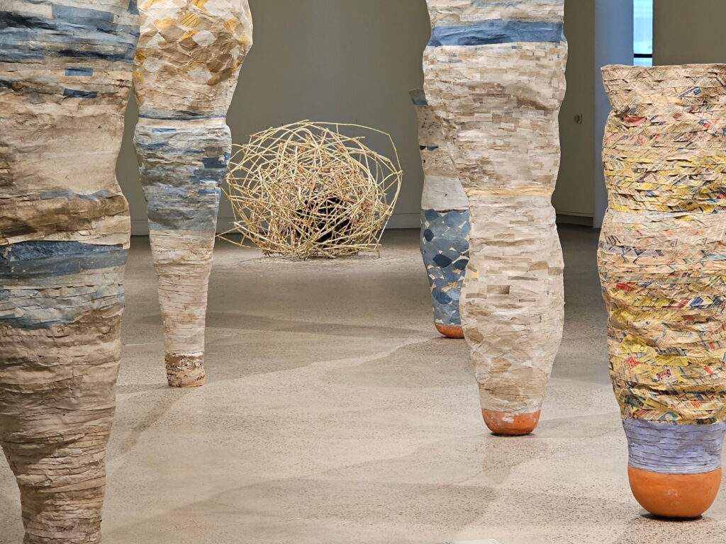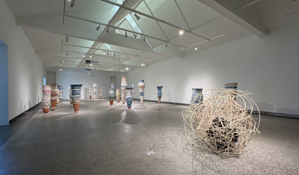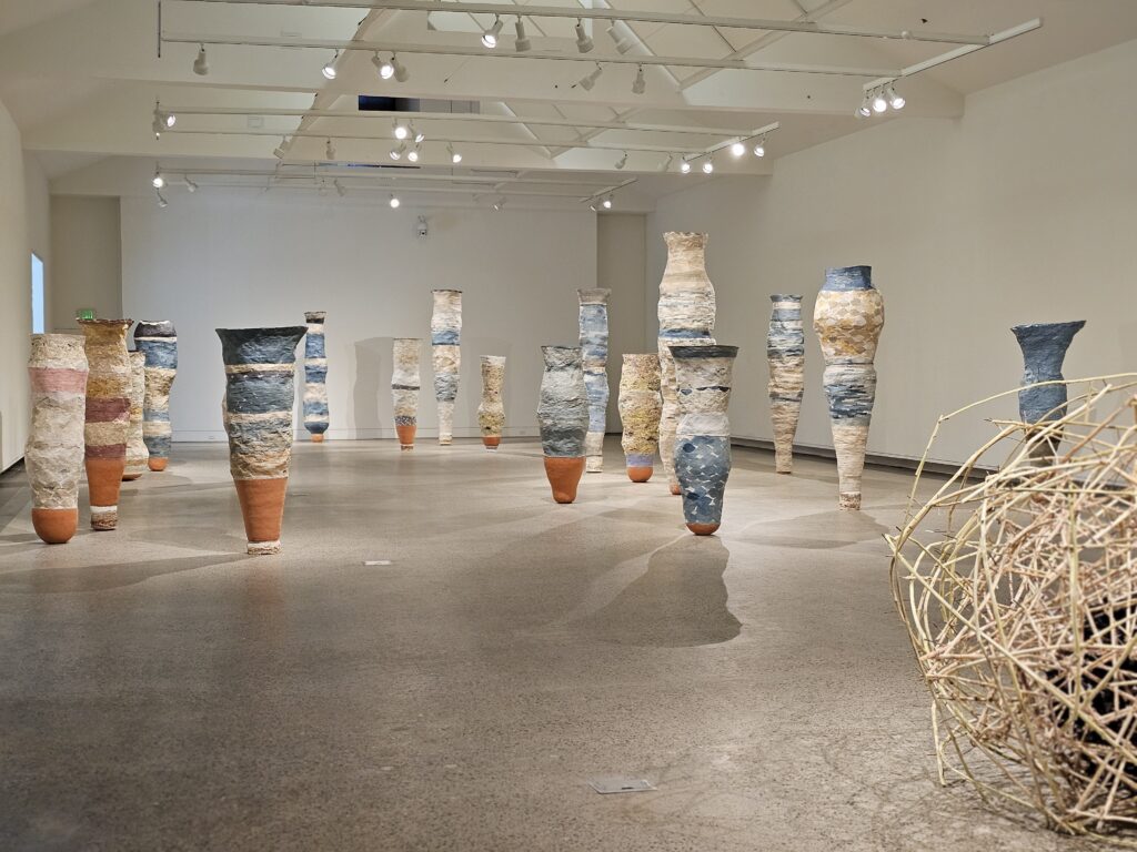Embedded in the Overlap Yellowstone Art Museum, Billings, MT April 3, 2026 – January 9, 2027 August 6th Opening Reception & Artist Talk Embedded in the Overlap presents twenty-two vessels, forty-five prints, and two tumbleweed sculptures. Created from locally sourced materials and composed with sensitivity to site, the works center on the social and cultural history of Billings, Montana. They trace layers of archaeology, time, and transformation, considering what has unfolded from river to rim: Indigenous presence, pioneering westward migration, industrialization, and ongoing settlement and modernization. Hutchinson brings together both natural and industrial materials. Local Montana clay, sugar beet pulp from the Western Sugar Company, blue jeans, and 100% cotton, worn-out garments are used to form the vessels- harvested creek willow from Montana creeks shape the tumbleweed sculptures. Fibers from these materials are pulped into handmade paper, and Montana clay binds the forms through a paper-clay process. The installation extends beyond the gallery into the hallway where a collection of prints-created through layers of monoprinting and silkscreen processes foregrounds weather as a distinctive marker of place. Here, weather becomes part of a broader reflection on movement and adaptation, inviting viewers to consider how we arrive in a place and how we persist within it. Post navigation Previous Post